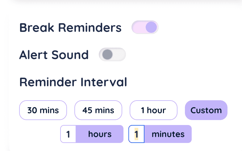Break reminders, alerts sound, 30mins, 45mins, 1 hr, save CTA, dark mode etc functionally broken.
